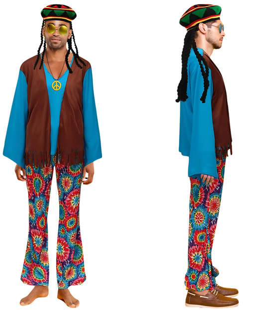60s 70s Hippie Costume for Men Hippie Pant Shirt Faux Vest Rasta Hat with Dreadlocks