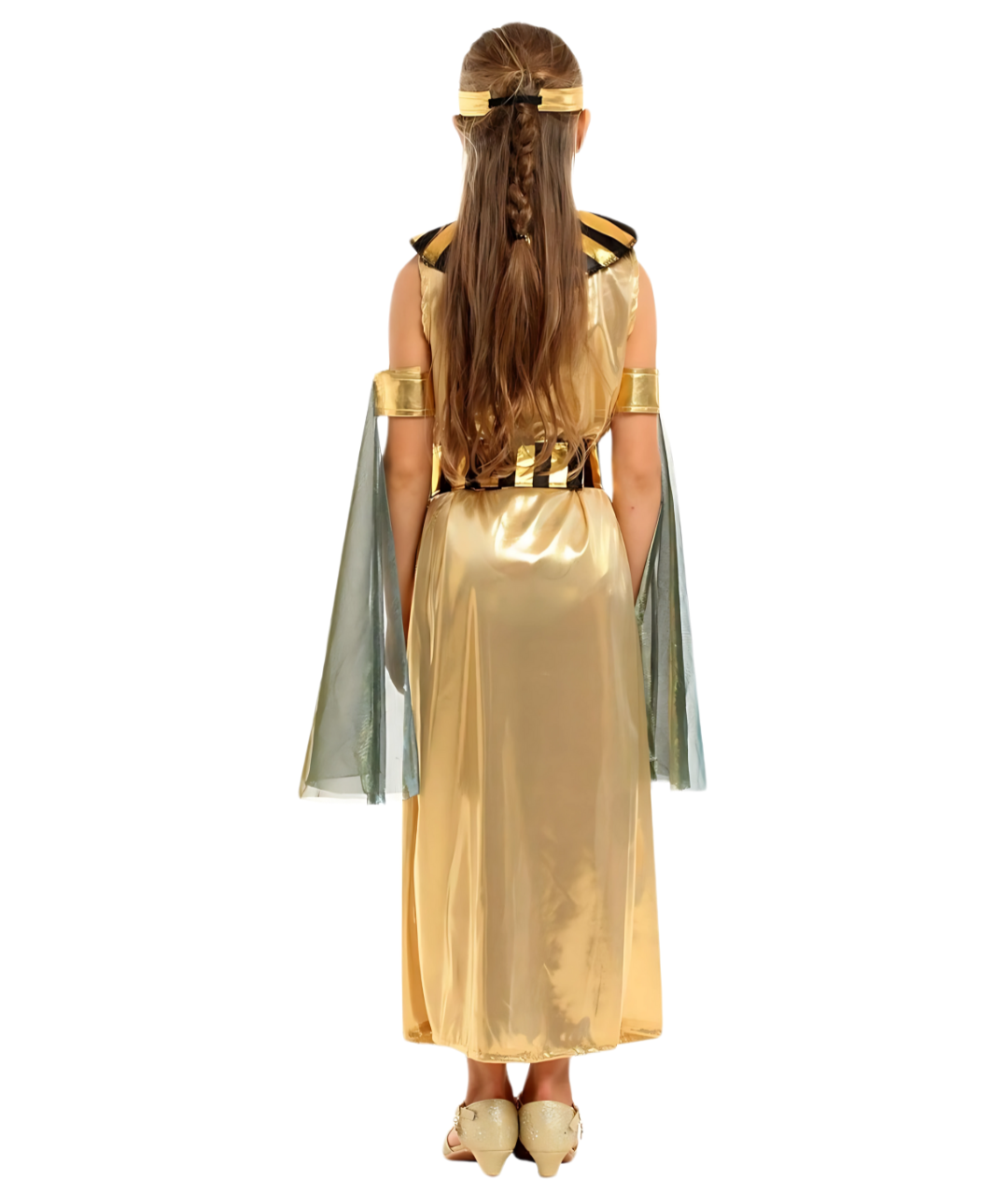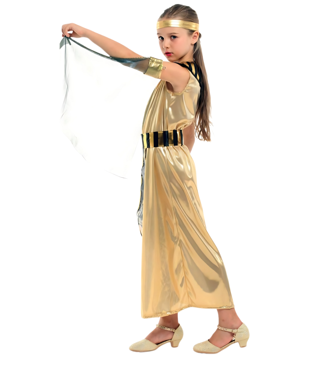 إذا كانت ابنتك تريد زيًا قويًا ورائعًا لعيد الهالوين هذا، فسوف تحب طقم كليوباترا هذا. سيكون الفستان الذهبي الخفيف هو الشيء الذي كانت سترتديه في قصرها.