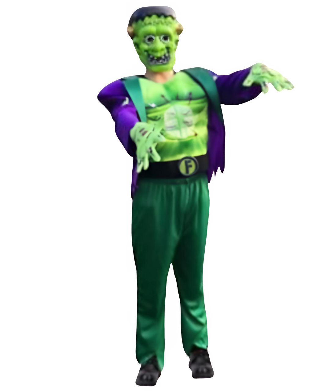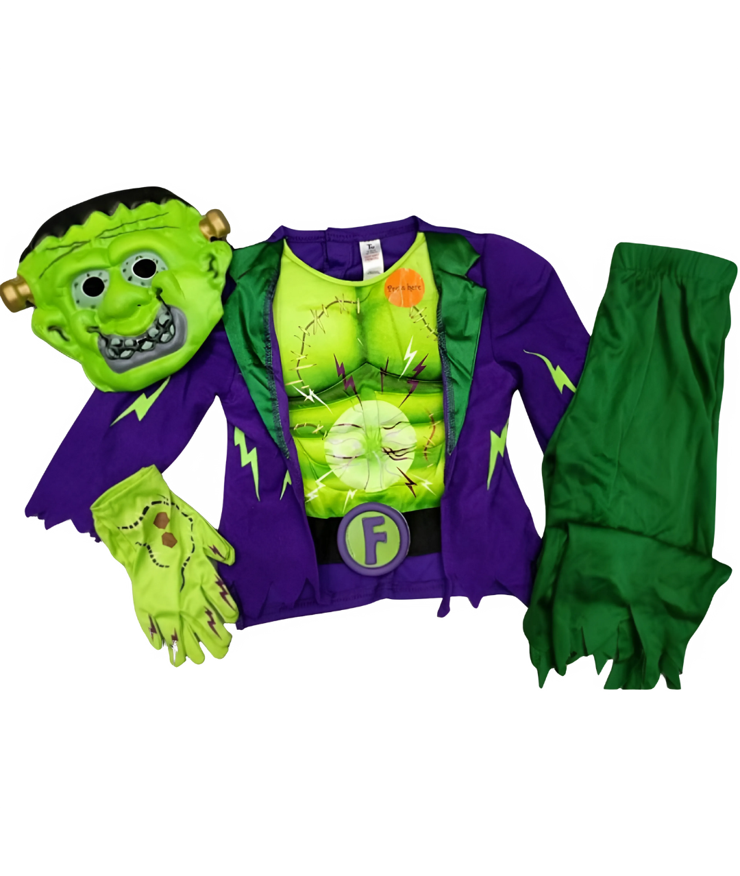 تتضمن المجموعة أيضًا قفازات خضراء وقناع EVA ناعم لجعل الصغار يبدون وكأنهم فرانكي شتاين حقيقي!