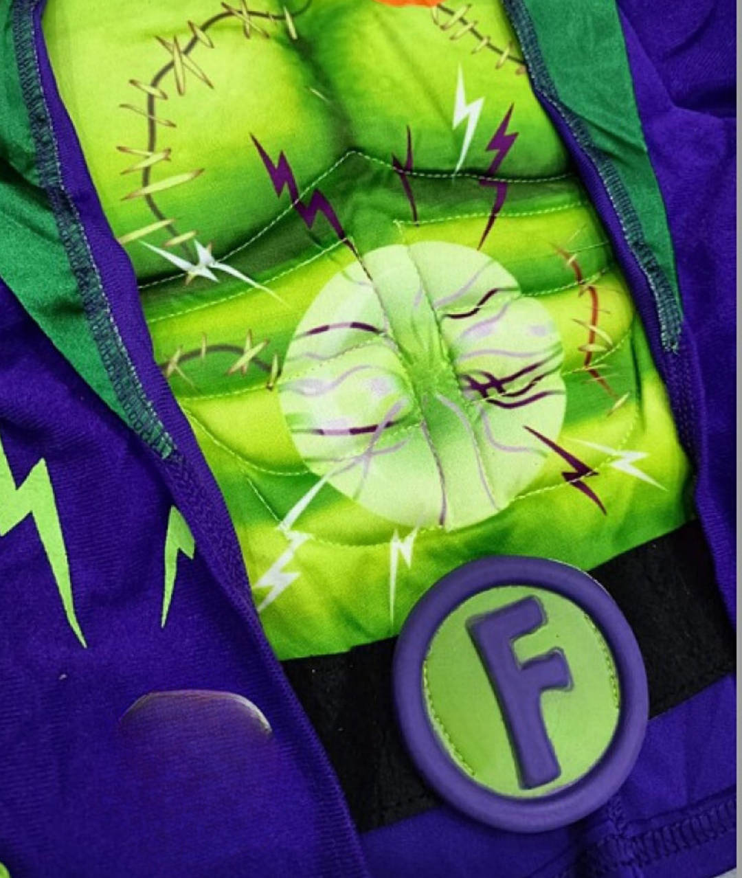 يتميز هذا الجزء العلوي المبطن للجذع العضلي بسترة أرجوانية متصلة بطبعة برق وحواف من الساتان، بالإضافة إلى حزام متصل بشعار "F".
