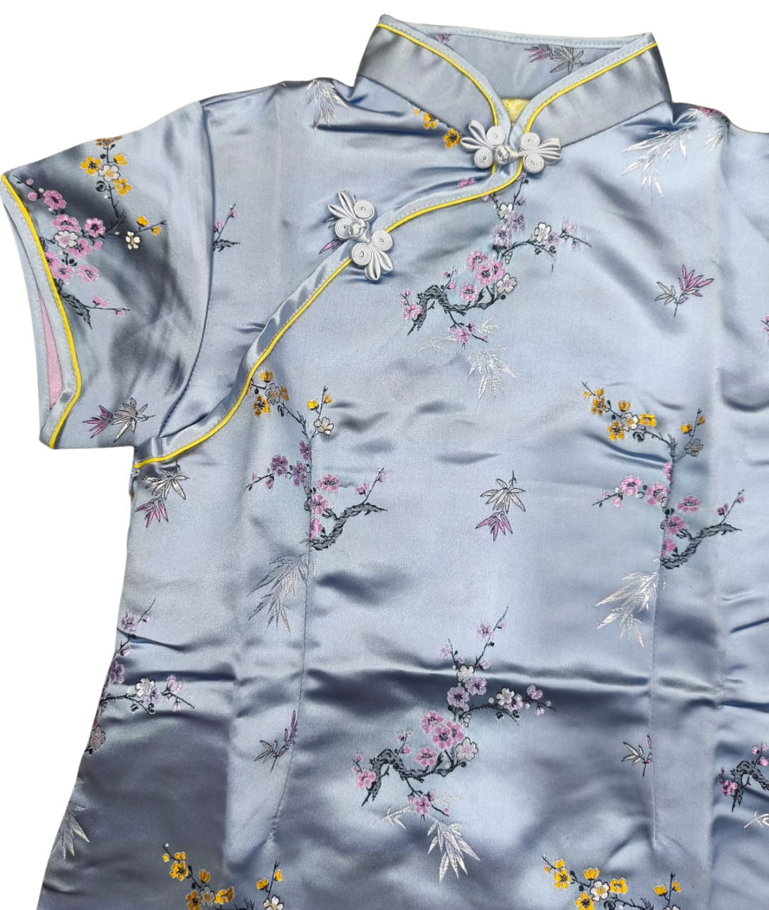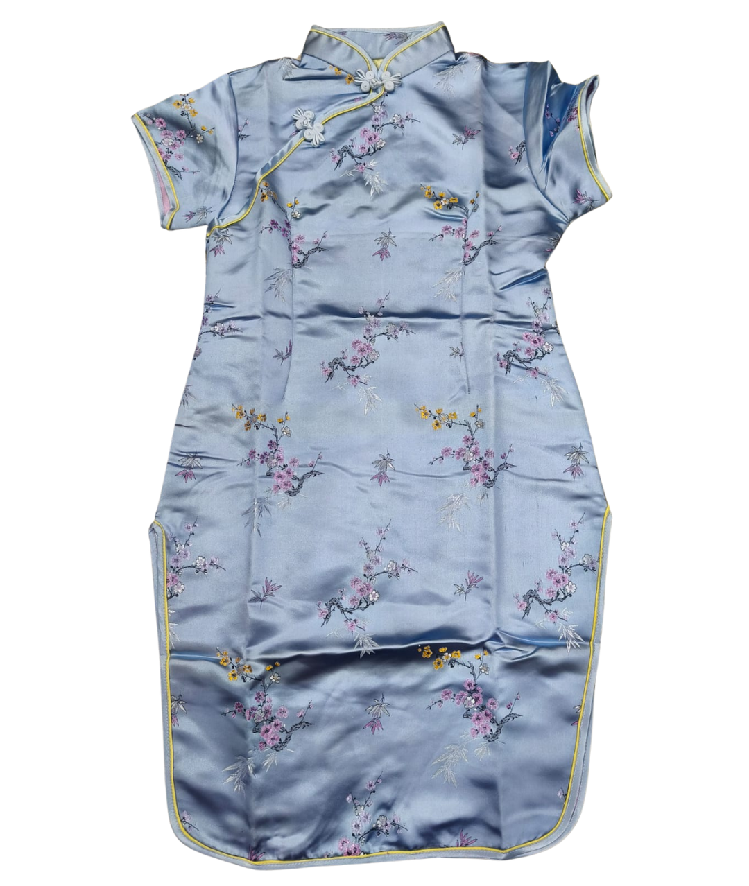 فستان تشيباو شيونغسام صيني للبنات باللون الفضي مناسب للأعمار من 10 إلى 13 عامًا.