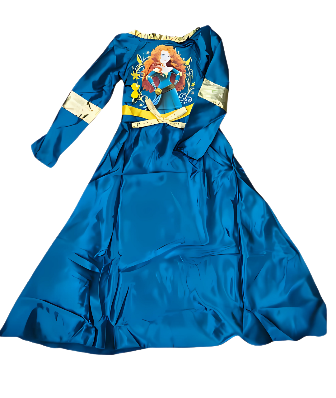 هذا الزي الجميل للأميرة ميريدا يتضمن فستانًا طويلًا أزرق داكنًا وذهبيًا، مزينًا بطبعة شخصية على الصدر، ليحوّل كل فتاة إلى أميرة ديزني ساحرة. كما أن مقدمة الفستان مزينة بحواف ذهبية وعقدة ذهبية.