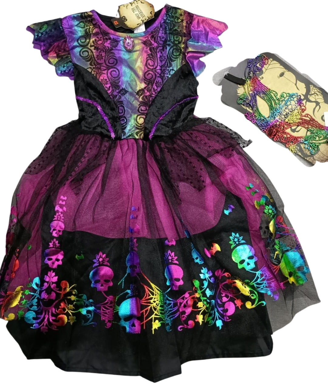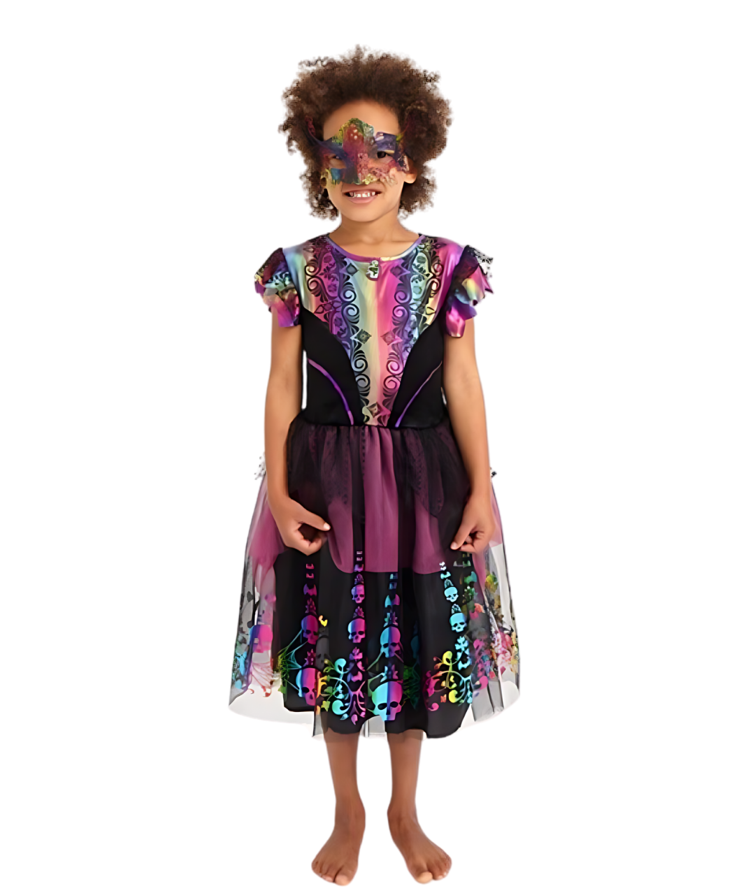 يتميز هذا الزي بفستان ملون لامع مع تنورة متعددة الطبقات مزينة بتفاصيل الجمجمة والترتر لإضفاء المزيد من الرعب.