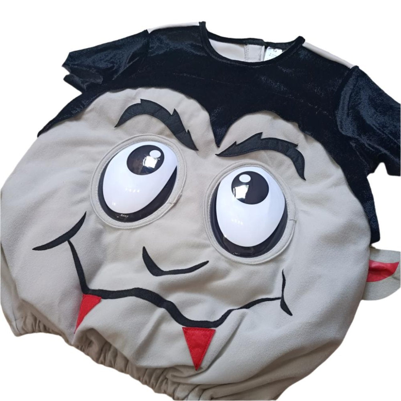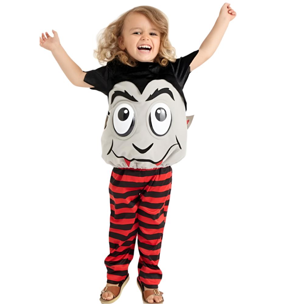 This dramatic Dracula costume includes a not-so-friendly vampire face with large googly eyes, and a pair of coordinating bottoms with elasticated waist.