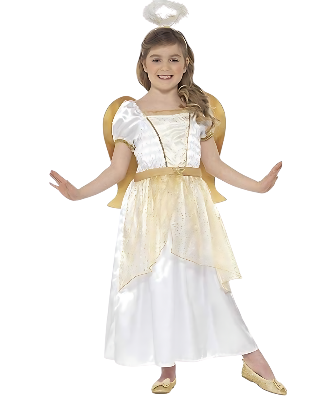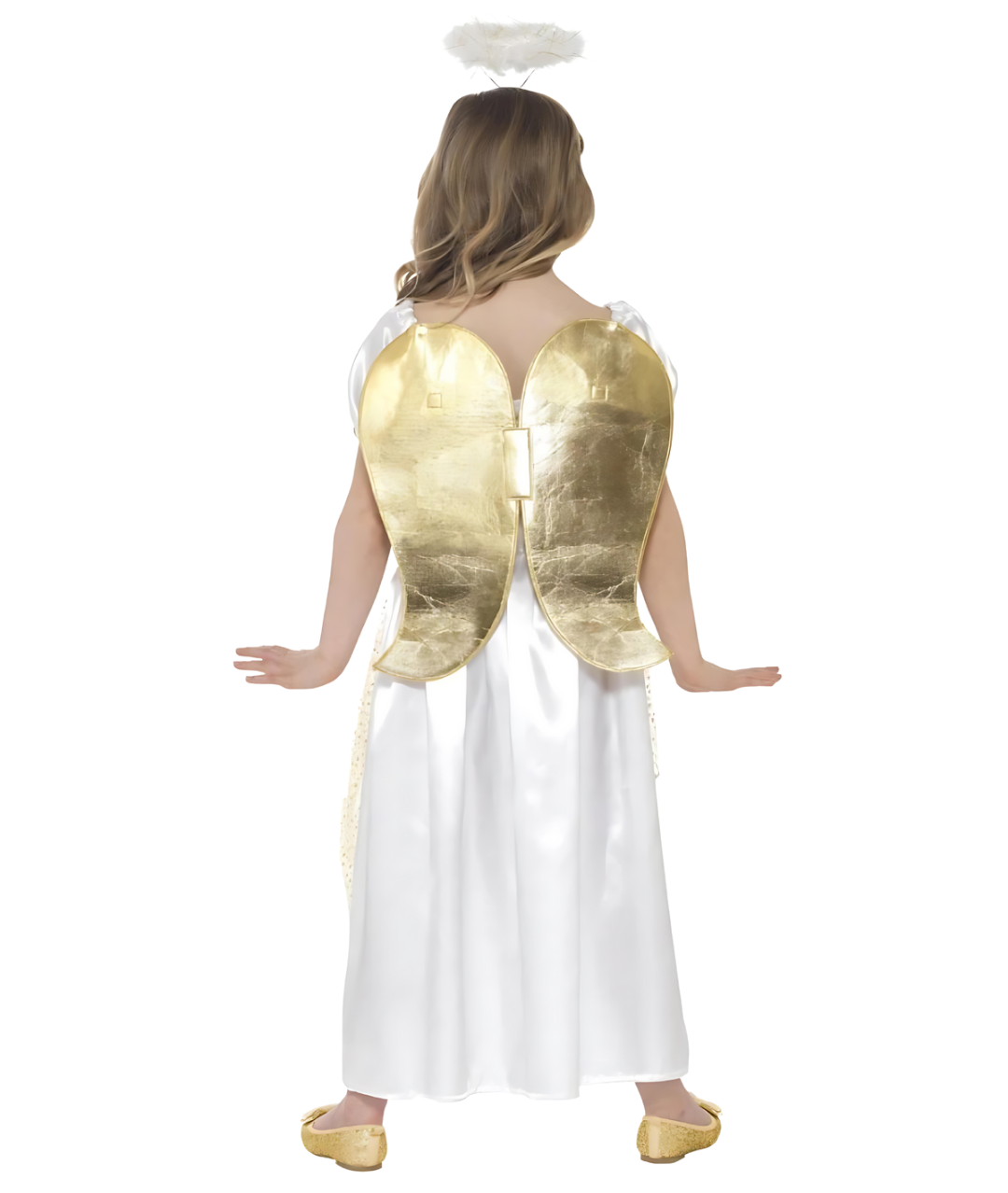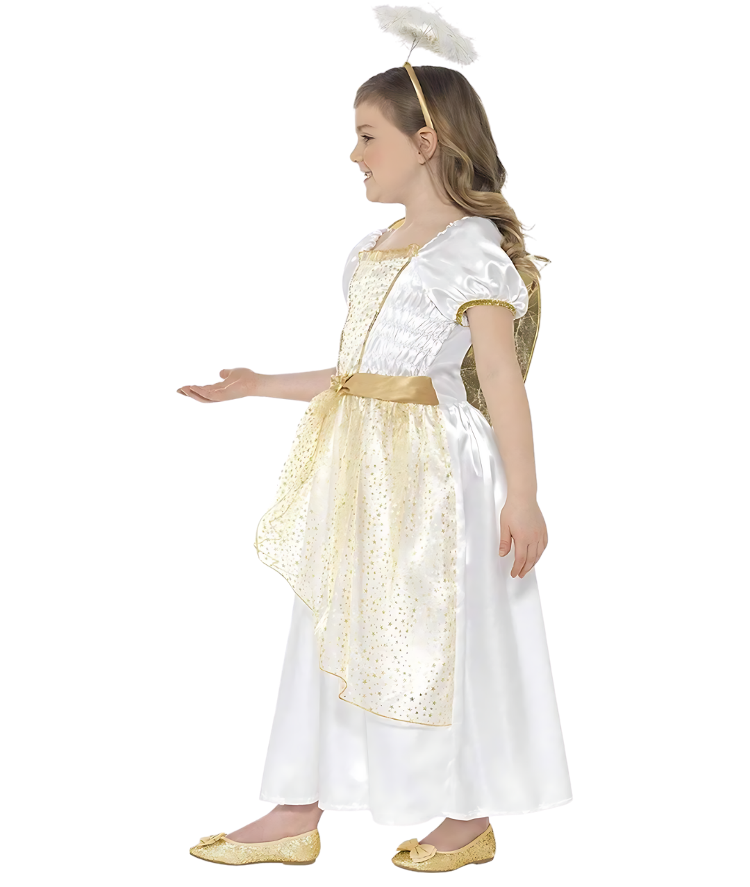Get your little one party play ready with this angel fancy dress costume! This gorgeous dress features gold star netting and elasticated straps. This set includes a halo headband and a pair of wings which attach to the dress with one touch fastening.
