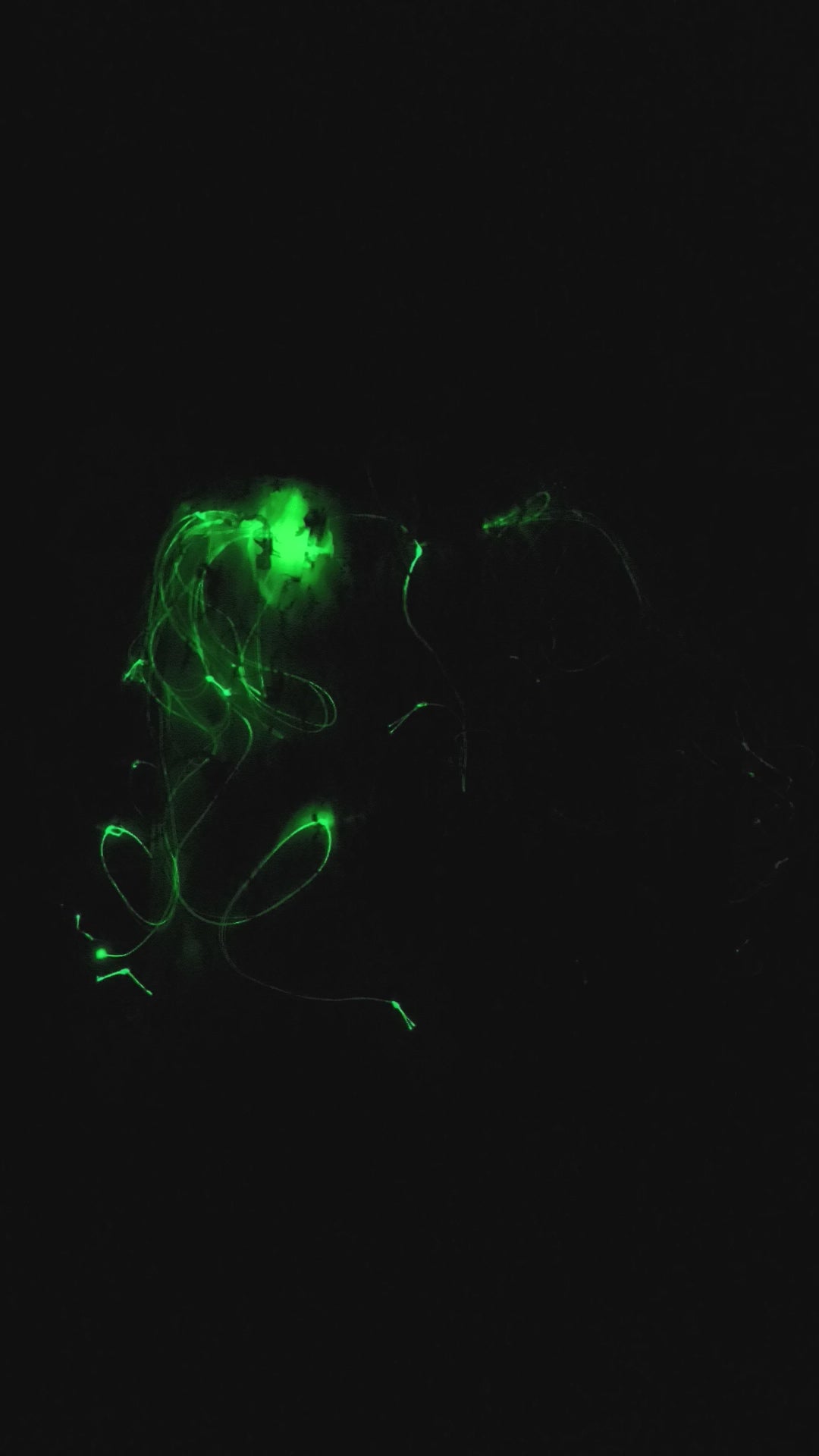 It is a light up costume. Lights blinks green. Lights are in front of the skirt.
